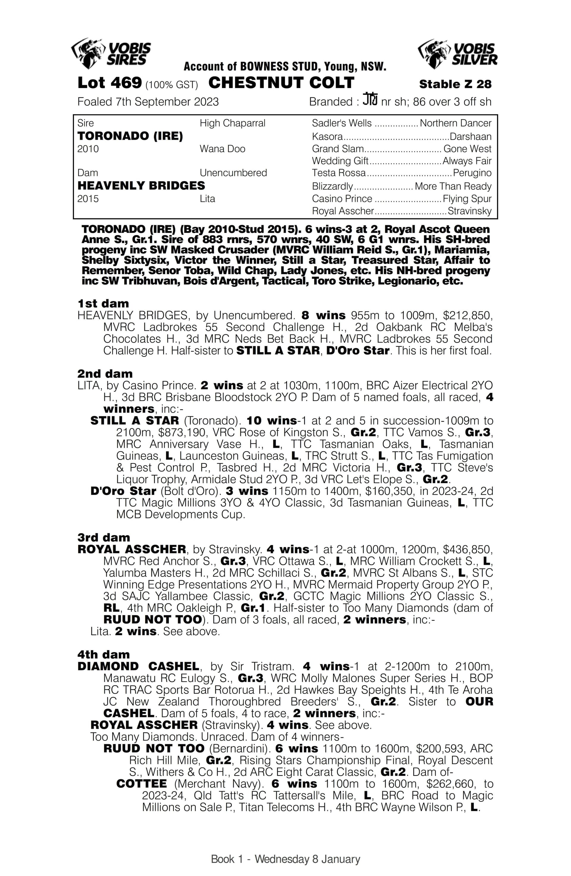 By top class stallion TORONADO ($88,000 service fee) – 80 stakes performers from 7 crops to race including Group 1 winners like MASKED CRUSADER, MARIAMIA & BOIS D’ARGENT, etc
