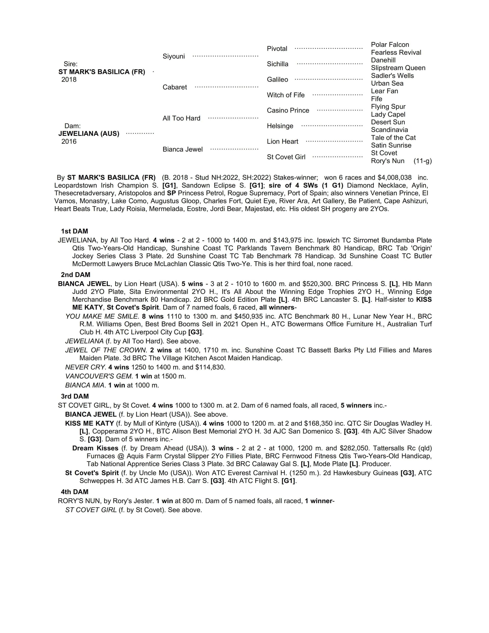 Eye-catching filly from a female dominant family – 8 of the 9 fillies on the page have won including a trio of fast, precocious stakes performers – BIANCA JEWEL, KISS ME KATY & ST COVET’S SPIRIT